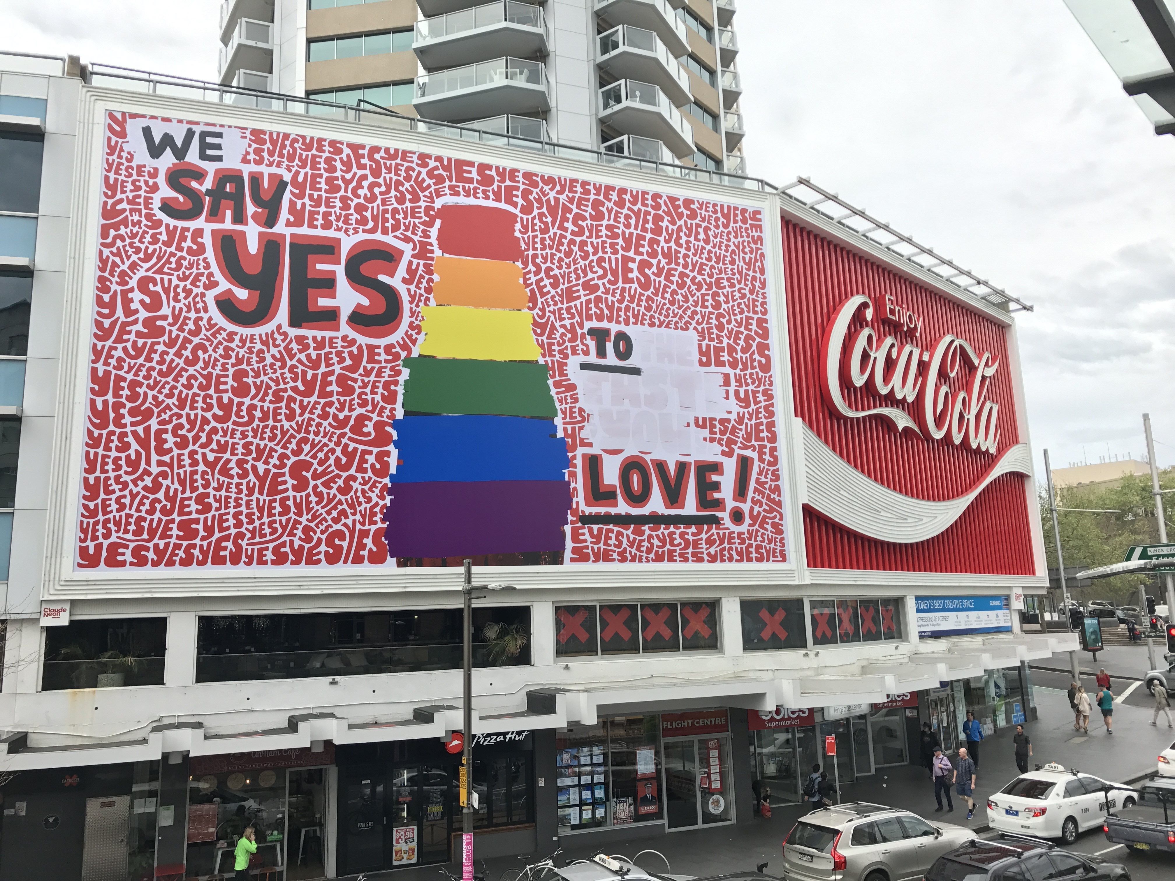 In 2017, during Australia's postal vote on marriage equality, Coca‑Cola launched limited-edition 'Love' cans and displayed 'Say Yes to Love' on its Kings Cross billboard. This marked the first time in 130 years that the iconic script was used for a non-logo purpose.