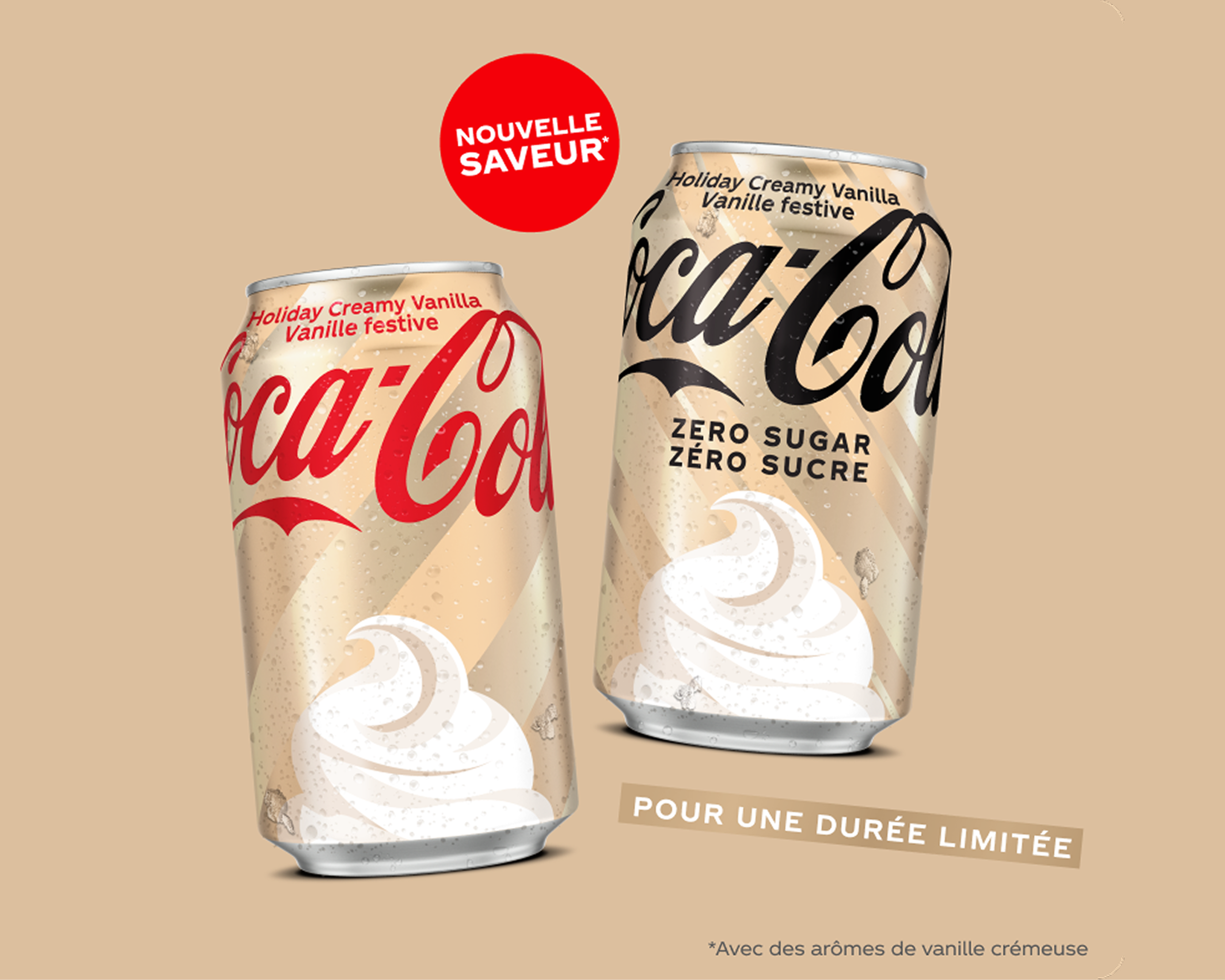 En ce temps des fêtes, tu es à la recherche de nouveauté? Les boissons gazeuses Coca‑Cola Vanille festive et Vanille festive Zéro sucre offrent le goût Coca‑Cola que tu aimes avec une saveur de vanille onctueuse et crémeuse. Ouvre une bouteille, verse-la sur des glaçons et laisse l’ambiance festive s’installer.