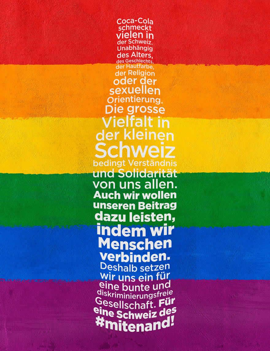Für eine Schweiz des #mitenand. Dass sich Coca‑Cola dieser Tage für eine bunte und diskriminierungsfreie Schweiz stark macht, kommt nicht von ungefähr. Denn Coca‑Colas Kredo – in der ganzen Welt und hier in der Schweiz – steht kategorisch für Gleichberechtigung, Vielfalt und Toleranz.