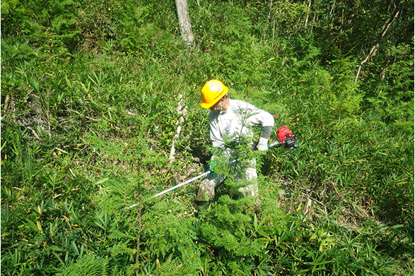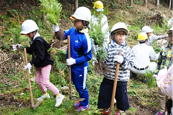 人工林の下刈・除伐・間伐作業を年間通して実施しています。また放置され荒廃した山林の機能回復を図るために枯損木等の伐倒整理、植林施業を行っています。また、小学生に森林のはたらきについて興味を持ってもらうために、学校を訪問しての環境学習、実際に森林内での体験学習(植林)を行っています。