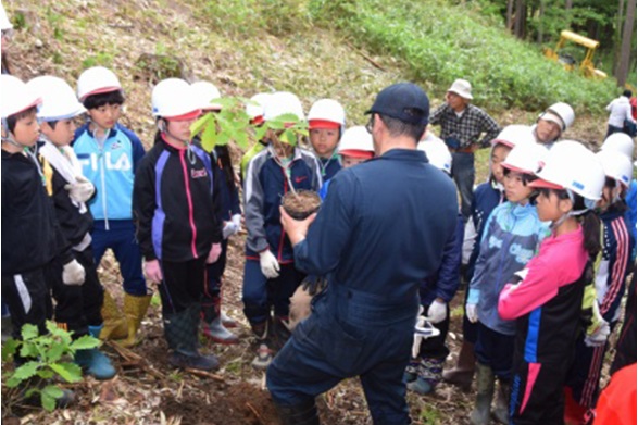 地元の小学校を訪問し、環境学習として森林のはたらきについて授業を行いました。その後、授業内容を自然の中で感じてもらうために、体験学習として、実際に付近の山林を訪れ、植林体験を一緒に行いました。