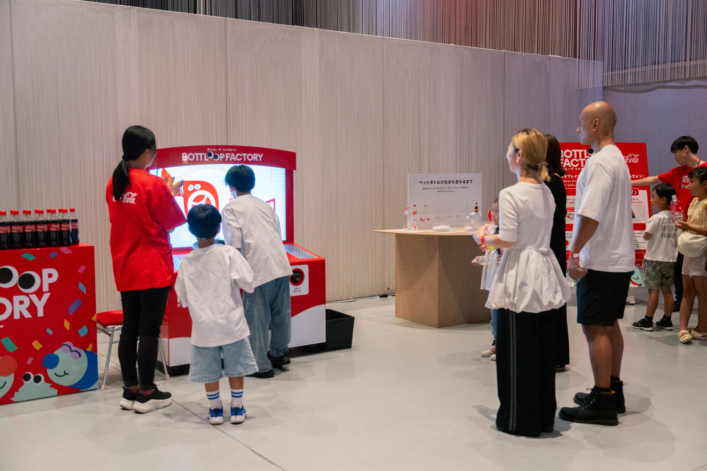 ボトループファクトリーはペットボトルをもう一度ペットボトルとして再生する「ボトル to ボトル」の工程をゲーム化したマシンです。