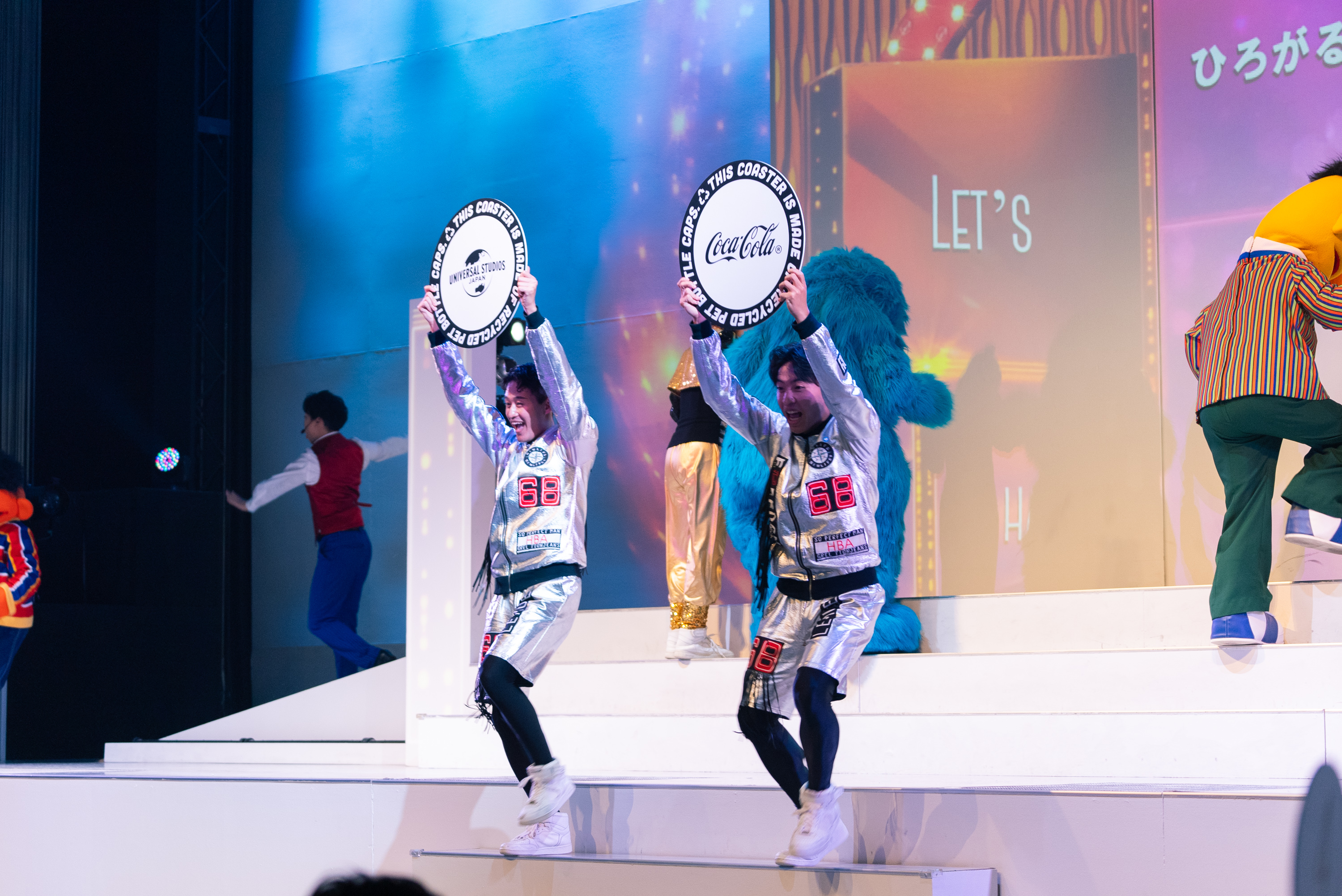 イベントの締めくくりには、USJならではのオリジナルショーがスタート。コースターパネルや使用済みPETボトルを使い、リサイクルをテーマにしたパフォーマンスが披露されました。ショーの中では、ボトル、ラベル、キャップを分別することなど、効率的な「ボトルtoボトル」に重要なことを改めて表現し、参加者の方々に正しいリサイクルについてショーを通じても学んでいただきました。