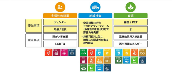 日本コカ・コーラ株式会社と全国5社のボトリング会社などから構成されるコカ·コーラシステムは、「世界中をうるおし、さわやかさを提供すること。前向きな変化をもたらすこと。」の事業目的にのっとり、日本が直面する重要な課題に対し、ビジネスを通じて変化をもたらしながら、未来を共創していくことに責任を持って取り組みます。2020年には「多様性の尊重」「地域社会」「資源」の3つのプラットフォームと9つの重点課題を特定し、システム共通のサスティナビリティーフレームワークを策定しました。各領域において事業活動を通じて社会課題の解決を目指すことで、持続可能な開発目標(SDGs)の達成にも貢献してまいります。