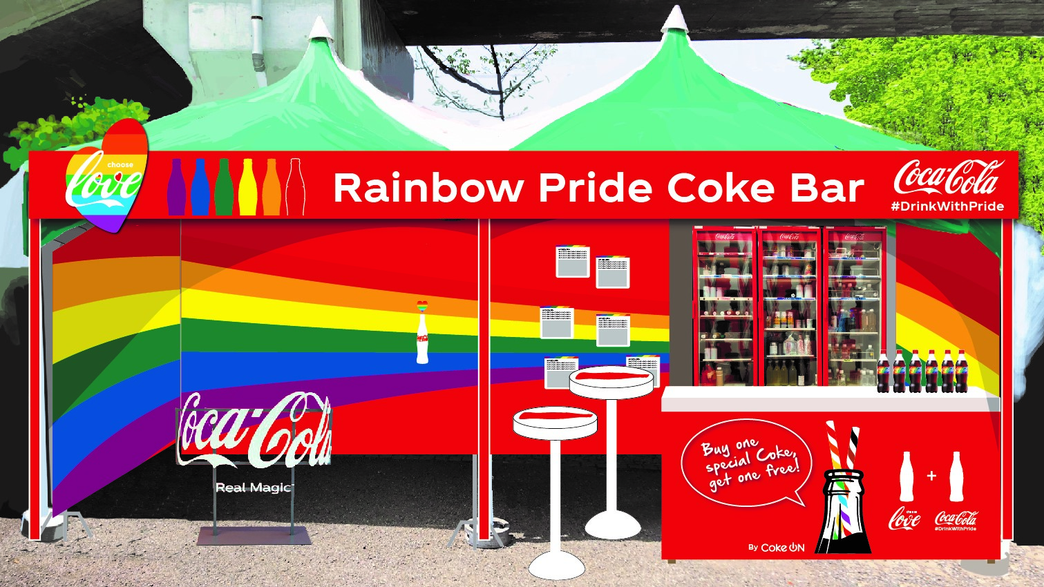 特製レインボーデザインの「コカ・コーラ」ラベルや「Coke On」チケットをプレゼント、コカ・コーラシステムのLGBTQに関する 取り組みをインフォメーションボードで紹介