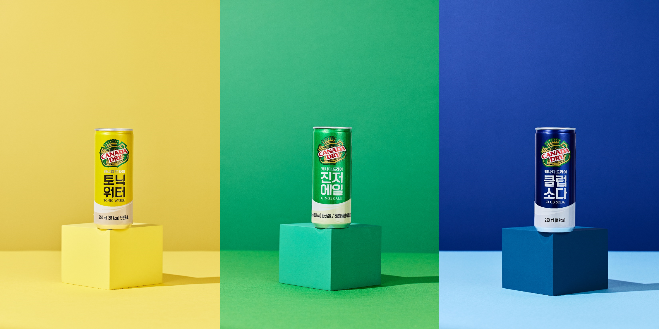 노란색의 토닉워터는 달콤하면서도 쌉쌀하고, 상큼한 레몬향이 기분 좋게 식도를 적신다. 초록색의 진저에일은 달콤하면서도 풍성한 맛이 느껴졌으며, 살짝 알싸한 생강향이 풍미를 더해준다. 파란색의 클럽소다는 무향, 무당의 깔끔한 맛으로, 제로 칼로리라 언제 어디서든 부담 없이 마실 수 있다.