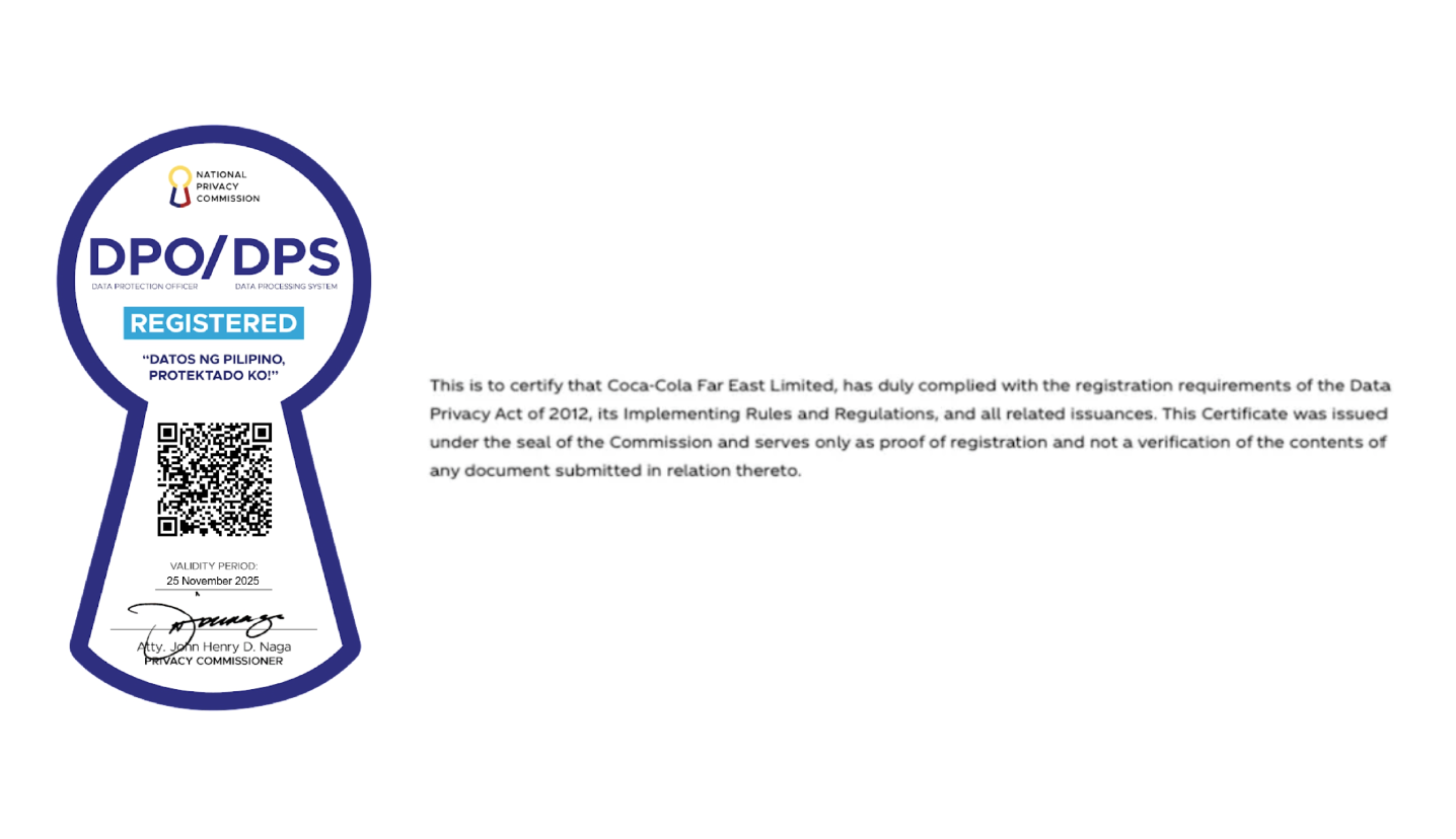 The controllers of your personal information are: Coca‑Cola Far East Ltd. (Philippines Regional Operating Headquarters) 27th Floor, Six/NEO Bldg., 5th Ave cor. 26th Street, Bonifacio Global City, Taguig