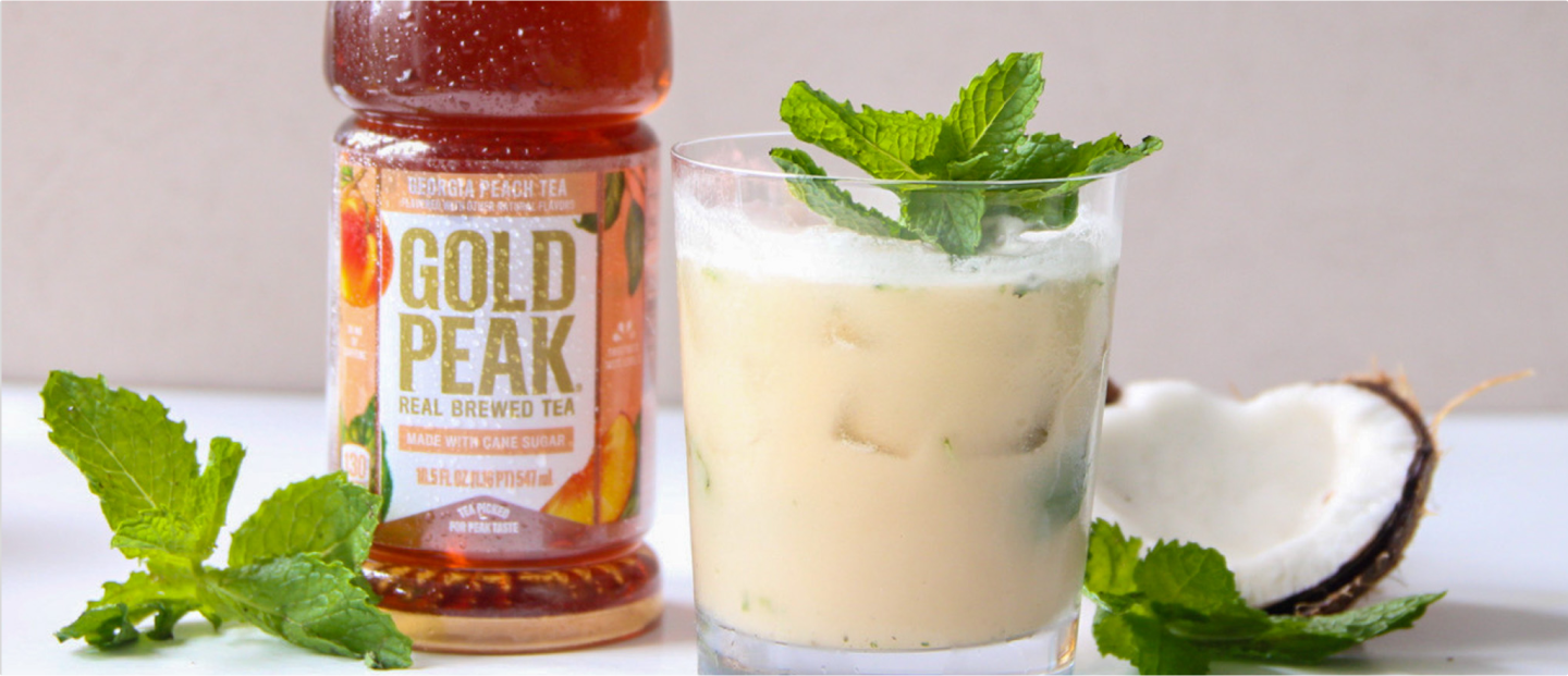 - Add Gold Peak Peach Tea, coconut water, and ice.