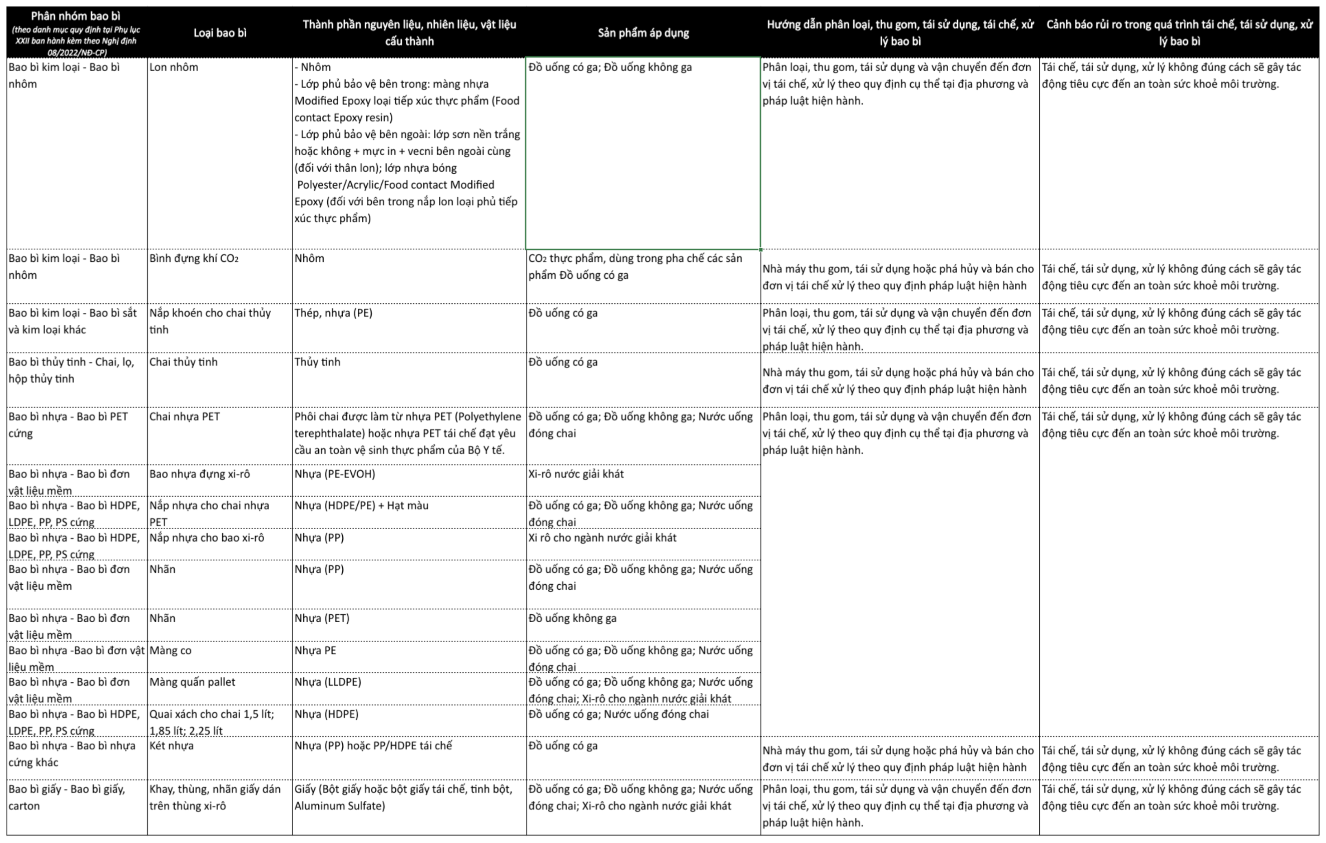 CÔNG KHAI THÔNG TIN VỀ BAO BÌ